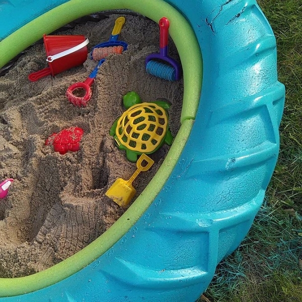 Самый простой вариант, как сделать песочницу на даче своими руками, — изготовить её из покрышки. От вас не потребуется ни вложений, ни расхода материалов, разве что на оформление.