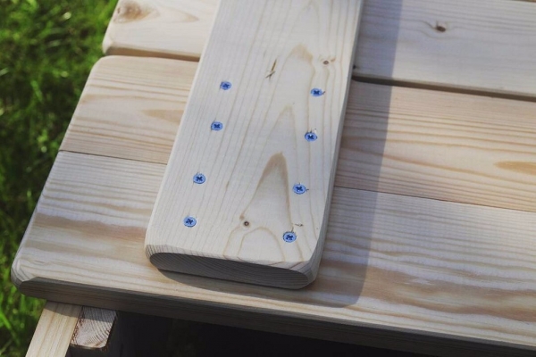 Дополнительно на третью и четвертую доски с наружной стороны можно установить ещё пару маленьких брусков. Они защитят сидящих от острых концов петель, обеспечат опору, чтобы в случае чего спинка не упала на спину, и дополнительно скреплят доски.