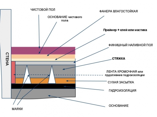 - Далее идут слои гидро- и теплоизоляции, устанавливаются маяки и производится заливка.
