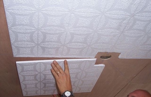 В этой точке может находиться крепеж для светильника, в этом случае углы у плиток нужно срезать. Место срезов прикроется в дальнейшем тарелкой люстры или потолочной розеткой. Края панели нужно выровнять по намеченным предварительно перпендикулярным линиям. Плитку плотно прижимайте при наклеивании к потолку, но следите, чтобы не осталось вмятин.